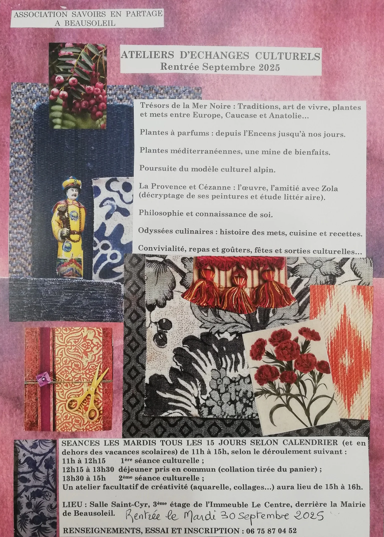 Les ateliers se tiennent à la Salle Saint-Cyr, dans l’Immeuble “Le Centre” à Beausoleil. Les dates exactes sont communiquées directement par les organisateurs, et les tarifs ne sont pas publiés en ligne. Pour toute information ou inscription, contactez le 06 75 87 04 52.